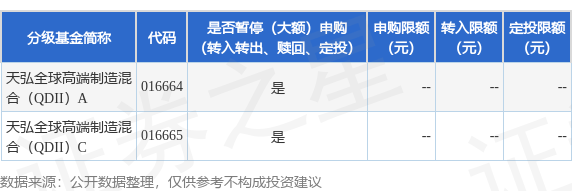 证券之星消息,11月27日天弘基金管理有限公司发布《天弘基金管理有限公司关于天弘全球高端制造混合型证券投资基金(QDII)调整大额申购及定期定额投资业务的公告》。公告中提示,为了保证基金的平稳运作,保护基金份额持有人利益,自2025年11月28日起天弘基金管理有限公司关于天弘全球高端制造混合型证券投资基金(QDII)调整大额申购及定期定额投资业务,申购、定投上限金额为1.0万元,下属分级基金调整明细如下: