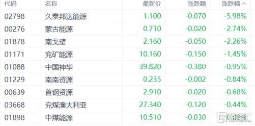 煤炭股走低,兖矿能源、中国神华、首钢资源、充煤澳大利亚、中煤能源纷纷下跌。