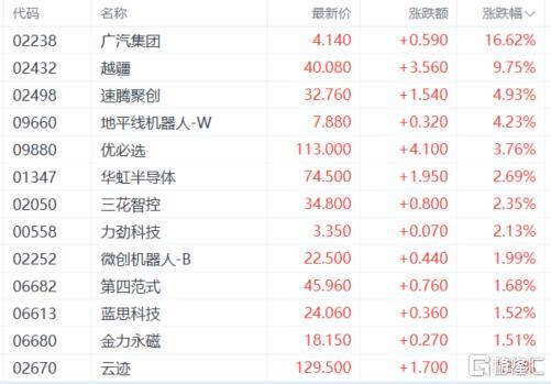 机器人概念股活跃,广汽集团涨超16%,越疆、速腾聚创、地平线机器人-W、优必选、华虹半导体、三花智控、力劲科技、微创机器人-B等跟涨。