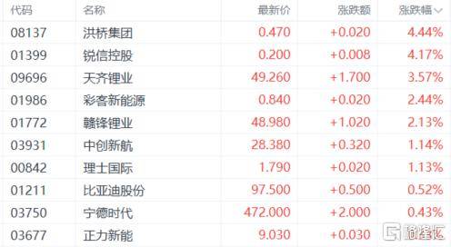 锂电池股上涨,洪桥集团涨超4%,天齐锂业、赣锋锂业、中创新航、理士国际、比亚迪股份、宁德时代等跟涨。