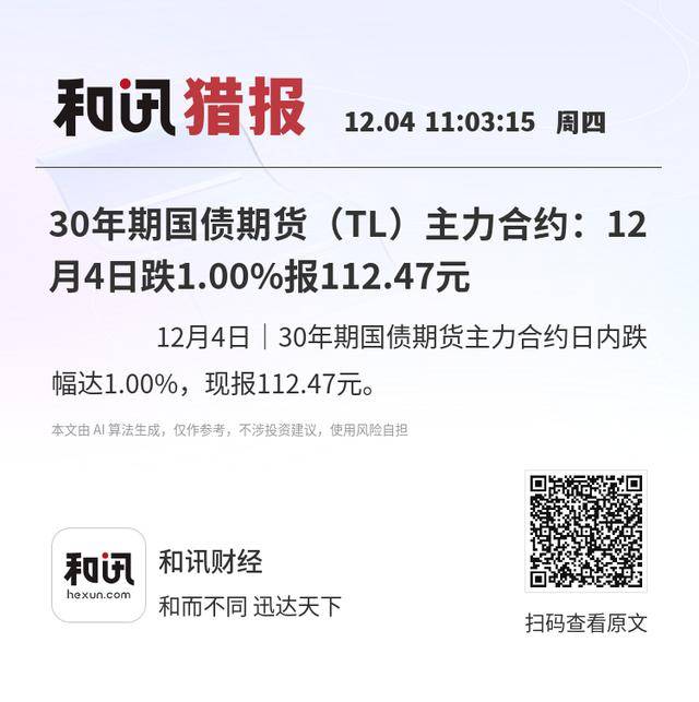 12月4日|30年期国债期货主力合约日内跌幅达1.00%,现报112.47元。