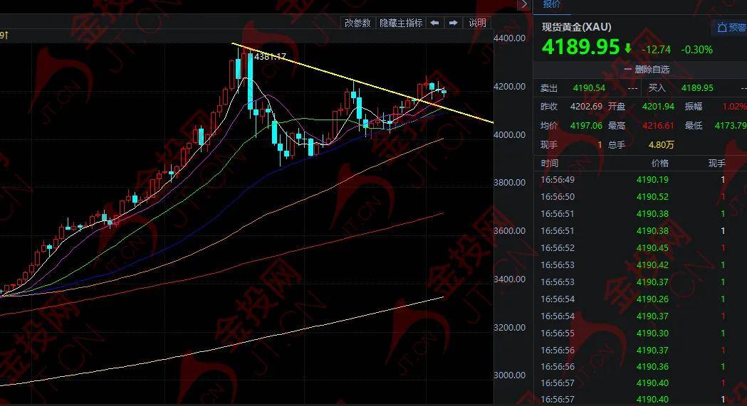 隔夜,现货黄金大多数时间稳定在4200上方,疲软的美国就业数据一度帮助金价盘中触及4241.40美元的高点,但尾盘回吐涨幅,收报4203美元附近,接近收平。今日欧市盘中,黄金小幅下跌,目前在4188美元附近徘徊。