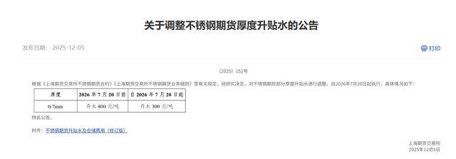 12月5日,根据《上海期货交易所不锈钢期货合约》《上海期货交易所不锈钢期货业务细则》等有关规定,经研究决定,对不锈钢期货部分厚度升贴水进行调整,自2026年7月20日起执行。