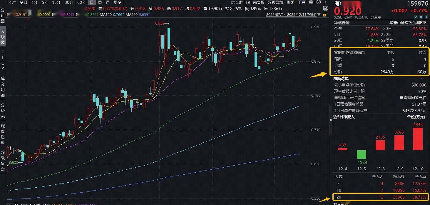 或由于美联储如期降息,利好有色金属板块,12月11日,揽尽有色金属行业龙头的有色龙头ETF(159876)场内价格盘中涨逾1.3%,现涨0.77%,值得关注的是,截至发稿,该ETF获资金实时净申购2880万份,深交所数据显示,此前3日该ETF狂揽1.04亿元,反映资金看好板块后市,积极进场布局!