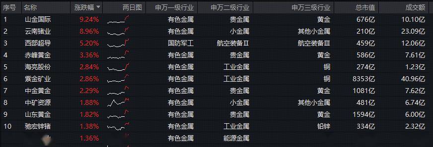 细分方向来看,黄金股表现活跃,山金国际领涨超9%,赤峰黄金涨逾3%,中金黄金涨超2%;直接配套低轨卫星组网需求,专注空间太阳能电池用锗晶片建设项目,国内锗产业链最完整、产销量第一的云南锗业涨近9%。权重股紫金矿业涨近3%,洛阳钼业、山东黄金涨逾1%。