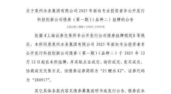 12月11日,上交所发布关于泉州水务集团有限公司2025年面向专业投资者非公开发行科技创新公司债券(第一期)(品种二)挂牌的公告。