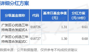 证券之星消息,12月12日发布《广发匠心优选三年持有期混合型发起式证券投资基金分红公告》。本次分红为2025年度的第1次分红。公告显示,本次分红的收益分配基准日为12月12日,详细分红方案如下: