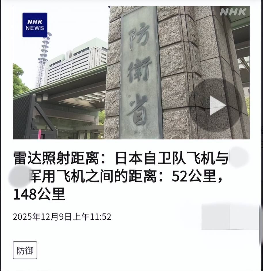 对于日本航空自卫队F-15J战斗机滋扰中国海军辽宁号航母战斗群日常训练,2025年12月9日,日本媒体NHK曝光了中国海军歼-15T舰载机雷达照射日本航空自卫队F-15J战斗机的详情,按照日本媒体爆料,第一次,中国海军歼-15T舰载机,日本航空自卫队F-15J战斗机,两架战斗机相距约52公里,第二次相距约148公里,均发生在大白天。