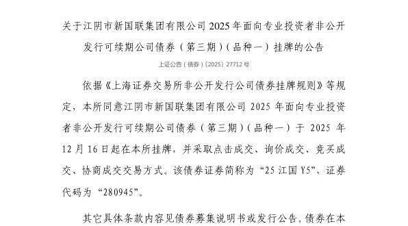 12月15日,上交所发布关于江阴市新国联集团有限公司2025年面向专业投资者非公开发行可续期公司债券(第三期)(品种一)挂牌的公告。