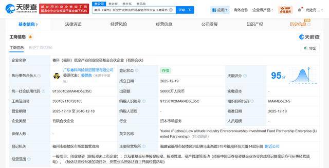 天眼查App显示,近日,粤科(福州)低空产业创业投资基金合伙企业(有限合伙)成立,执行事务合伙人为广东粤科风险投资管理有限公司,出资额5亿人民币,经营范围为创业投资,以私募基金从事股权投资、投资管理、资产管理等活动。合伙人信息显示,该基金由福州国资集团旗下福州榕投产业发展投资基金合伙企业(有限合伙)、广东省新兴产业投资基金合伙企业(有限合伙)、福州市规划设计研究院集团有限公司等共同出资。