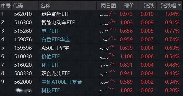 盘面热点轮动,锂电涨幅领先,产业链景气度持续攀升,绿色能源ETF(562010)、智能电动车ETF(516380)场内价格分别上涨1.04%、0.91%。