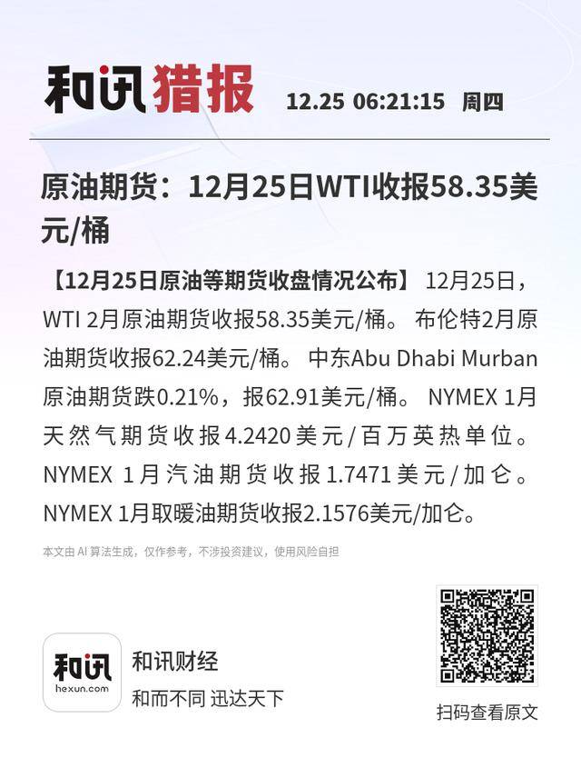 【12月25日原油等期货收盘情况公布】12月25日,WTI 2月原油期货收报58.35美元/桶。布伦特2月原油期货收报62.24美元/桶。中东Abu Dhabi Murban原油期货跌0.21%,报62.91美元/桶。NYMEX 1月天然气期货收报4.2420美元/百万英热单位。NYMEX 1月汽油期货收报1.7471美元/加仑。NYMEX 1月取暖油期货收报2.1576美元/加仑。