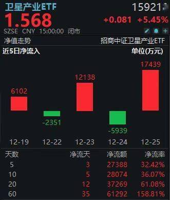 12月25日,卫星板块全面爆发!表征板块的卫星产业ETF(159218)强势收涨5.45%,其前两大权重股航天电子、中国卫星双双涨停,带动板块人气。市场交投空前活跃,该ETF单日成交额突破4.5亿元,结合行情数据预估,盘中获净流入约1.7亿元,其成交、价格与资金流入三项指标均创下历史新高。