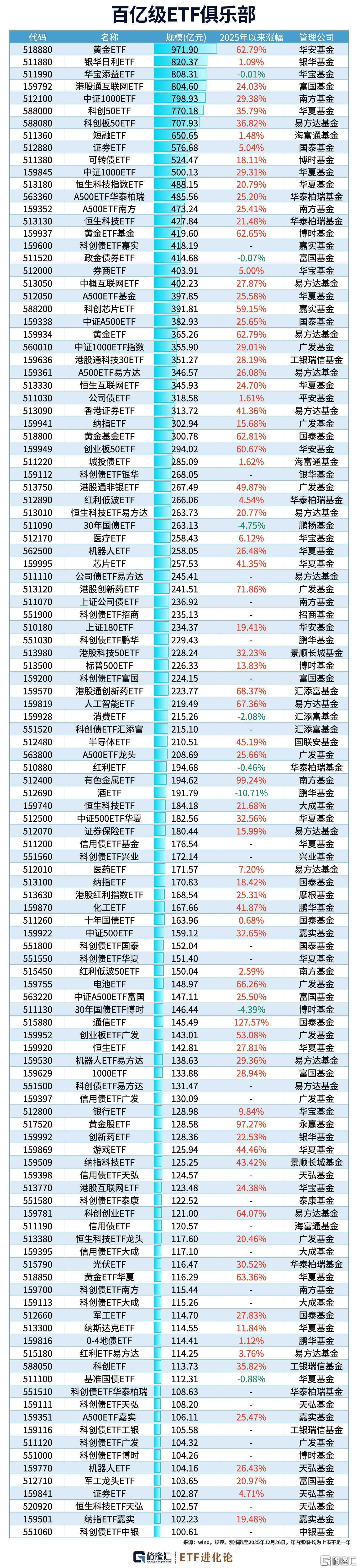 2025年,50只ETF年内净流入超过百亿元。港股、黄金、证券、债券,成为年度的“吸金王”。