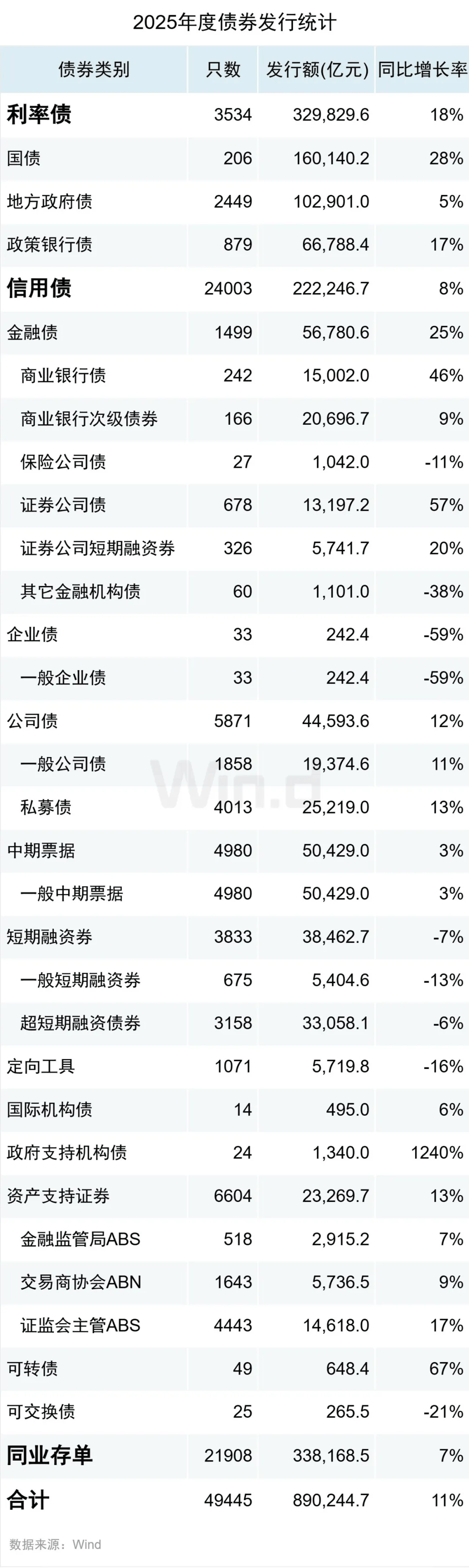 Wind统计各类债券发行数据显示,2025年度中国内地债券发行增势不减,全年各类债券发行合计89.0万亿,同比增长11%。利率债发行达到33.0万亿,较去年增长18%,其中国债同比增长28%、地方政府债同比增长5%、政策性金融债同比增长17%。信用债发行22.2万亿,较去年增长8%。同业存单累计发行33.8万亿,同比增长7%。