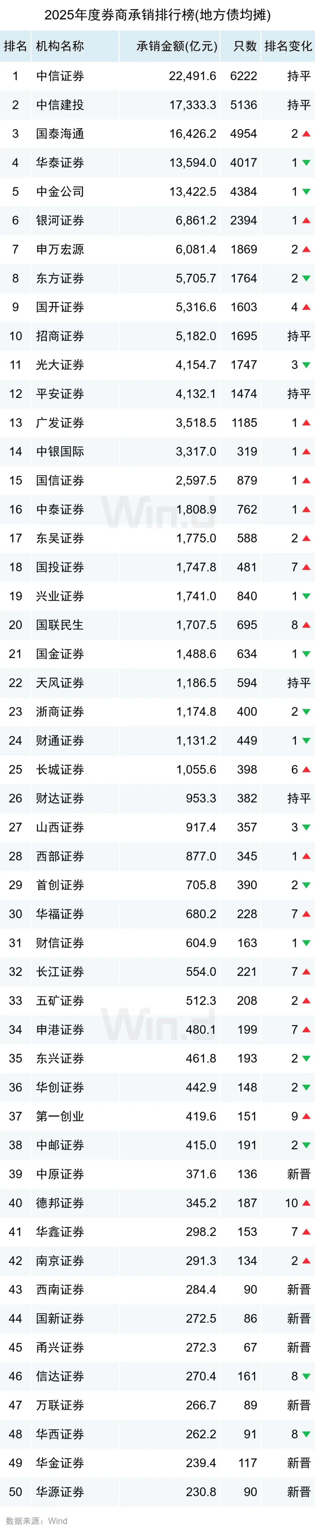 按照Wind口径统计券商(地方债均摊)总承销金额,中信证券、中信建投、国泰海通位列三甲,承销金额分别为22,491.6亿元、17,333.3亿元、16,426.2亿元。