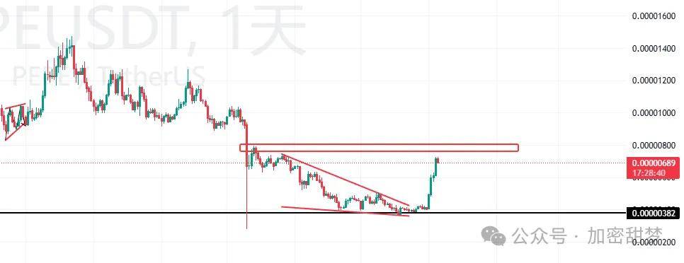 $PEPE走的还算是比较强的,提前走强于行情,目前PEPE日线级别出现下降楔形之后开始加速上涨,目前高点位置已经接近下降楔形起点位置了,所以上方处于压力区间。