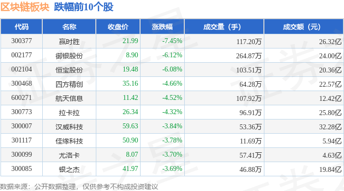 证券之星消息,1月7日区块链板块较上一交易日下跌0.82%,赢时胜领跌。当日上证指数报收于4085.77,上涨0.05%。深证成指报收于14030.56,上涨0.06%。区块链板块个股涨跌见下表: