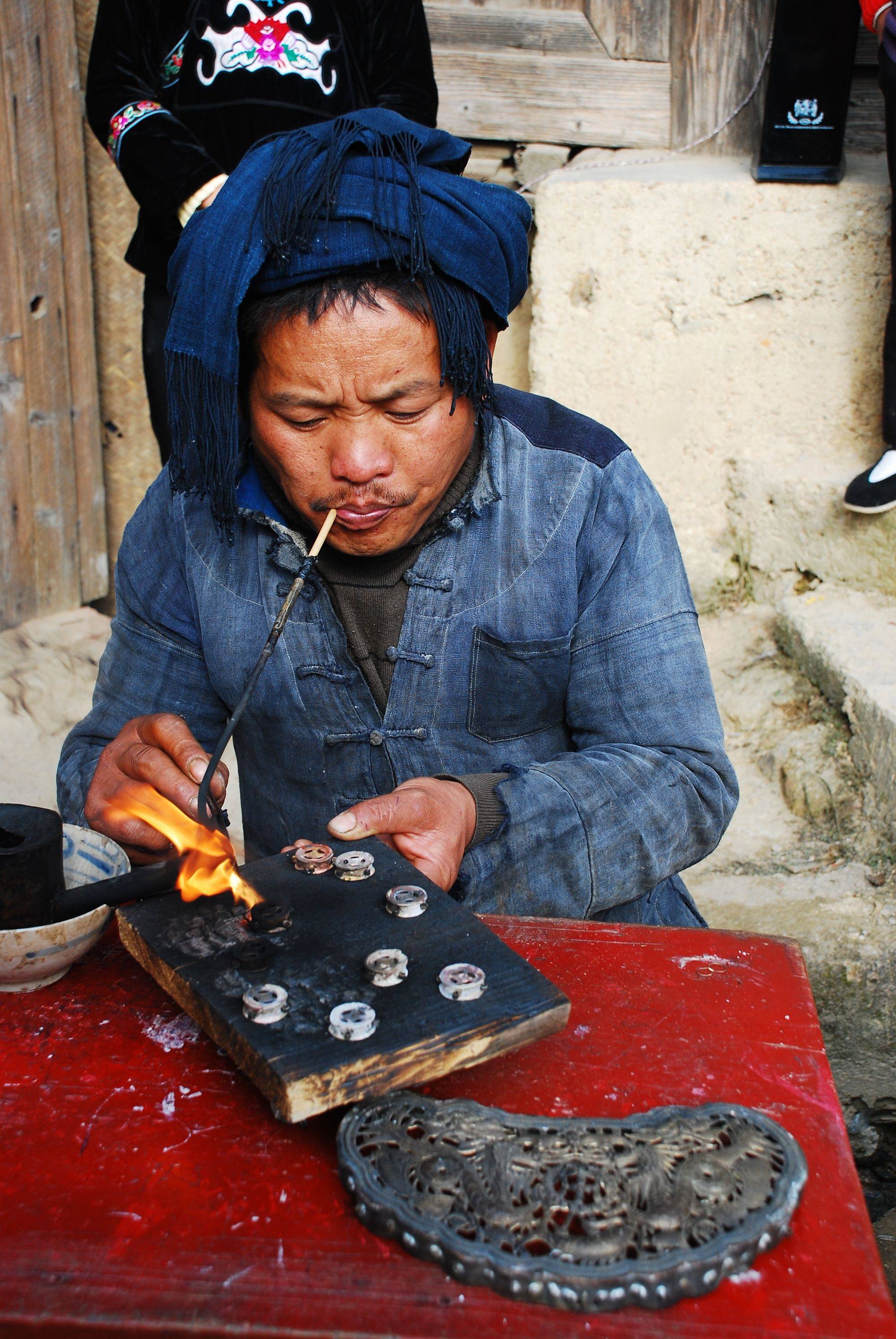 匠人在炉边熔银,这是制作银饰的第一步,喷火枪喷出灼热火焰,火星噼啪作响,银料随之慢慢融化,看似简单的过程其实需要对火候的精准把控。