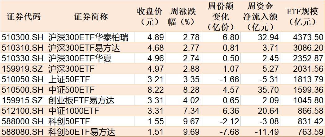 具体ETF方面,规模较大的10只宽基指数ETF本周合计净流入82.91亿元,其中沪深300ETF、中证500ETF净流入超30亿元。