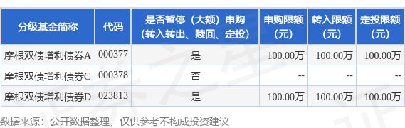 证券之星消息,1月13日摩根基金管理(中国)有限公司发布《摩根双债增利债券型证券投资基金暂停大额申购、转换转入、定期定额投资业务的公告》。公告中提示,为保证本基金的稳定运作,保护基金份额持有人利益,自2026年1月13日起摩根双债增利债券型证券投资基金暂停大额申购、转换转入、定期定额投资业务,下属分级基金调整明细如下:
