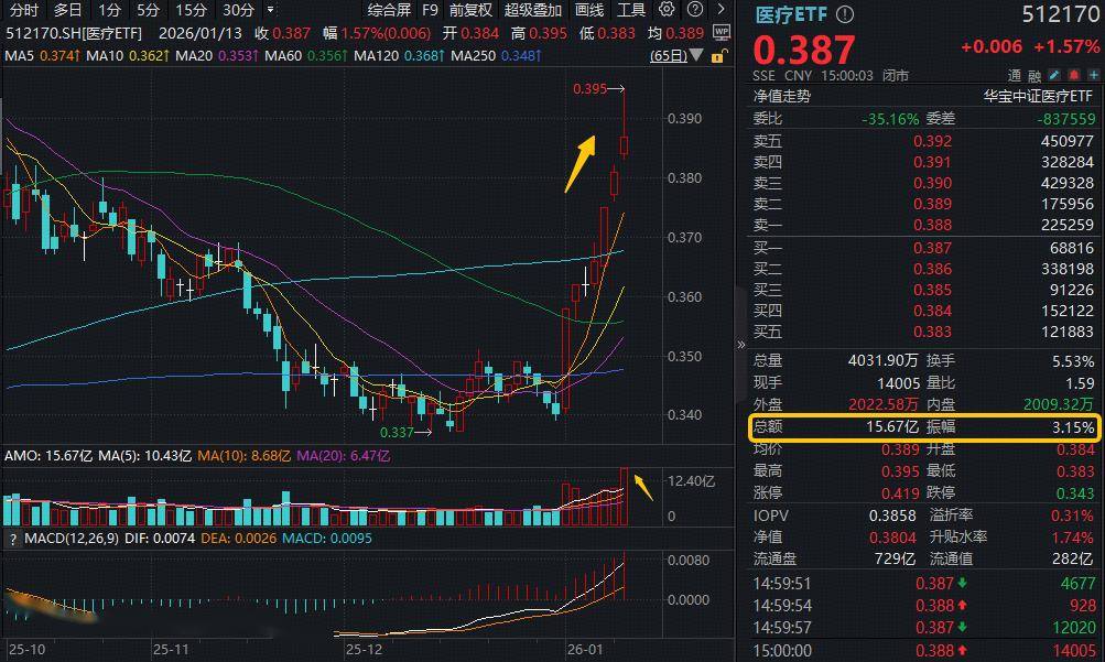 A股市场上,AI医疗概念同样领涨医疗板块,美年健康一字涨停喜提三连板,卫宁健康大涨7.79%,华大基因涨6%。全市场规模最大医疗ETF(512170)盘中摸高3.67%触及近3月高点,场内价格收涨1.57%四连阳,全天成交15.67亿元,创2024年10月10日以来单日成交额新高!