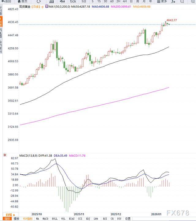 从日线走势来看,黄金在此前连续上行后于4650美元区域遇到明显技术阻力,价格重心开始回落,短期结构由强转弱。近期金价连续跌破5日与10日均线,显示多头节奏放缓,市场进入修正阶段。