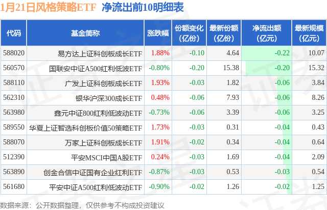 当日有12只风格策略ETF基金出现资金净流出,其中净流出排首位的是易方达上证科创板成长ETF(588020),份额减少了1000.0万份,净流出额为2173.99万元。