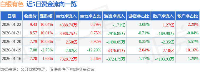 证券之星消息,截至2026年1月22日收盘,白银有色(601212)报收于9.43元,上涨10.04%,已连续涨停3天,换手率8.33%,成交量616.8万手,成交额55.55亿元。