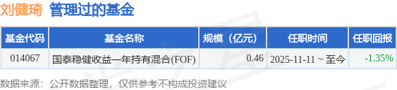 刘健琦先生:中国国籍,硕士研究生。2021年7月加入国泰基金,历任助理研究员、研究员、基金经理助理。2025年11月11日起任国泰稳健收益一年持有期混合型基金中基金(FOF)基金经理。