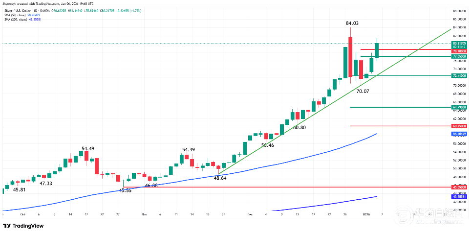 •银价突破78.70美元阻力位,涨至81.45美元,距离记录高位84.03美元价格已近在咫尺。