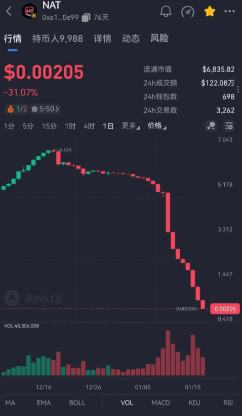 NAT自诞生起就依赖“原班人马”的噱头背书,声称在拉菲协议基础上完成升级优化,却始终未形成真实的盈利模式与应用场景。随着拉菲协议的崩盘,市场风险传导至NAT,但其支持者仍沉浸在“完美跨年”的幻想中,忽视了加密货币市场“无价值支撑必归零”的铁律。