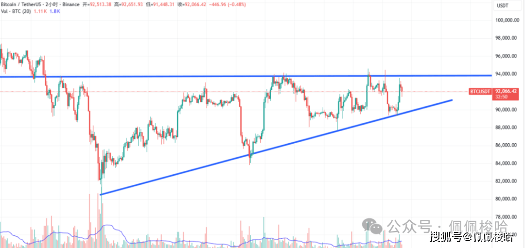 BTC盘整快3周了,整理的幅度越来越小,整个盘整形态接近尾声,最迟下周将即决出方向,倾向于是上升三角形,成立条件是突破93-94压力位,且下方只要不跌破87600依旧是完好多头结构,目标99000附近 重要的支撑压力。