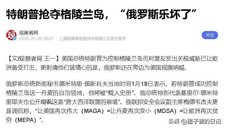 这番表态让俄罗斯收获了意外的“好处”。特朗普强硬对欧之际,俄罗斯高层的言辞更是充满了讽刺和挑衅。1月19日,俄罗斯总统发言人佩斯科夫公开表示,“若特朗普能成功控制格陵兰岛,必将被载入美国及世界史册”,并称“很难不同意专家的这个看法”。梅德韦杰夫则讽刺道,“让美国再次伟大就是让丹麦再次变小,也等于让欧洲再次贫穷”,并且不忘以反问结束这一番话,进一步加强对美欧关系的嘲讽。