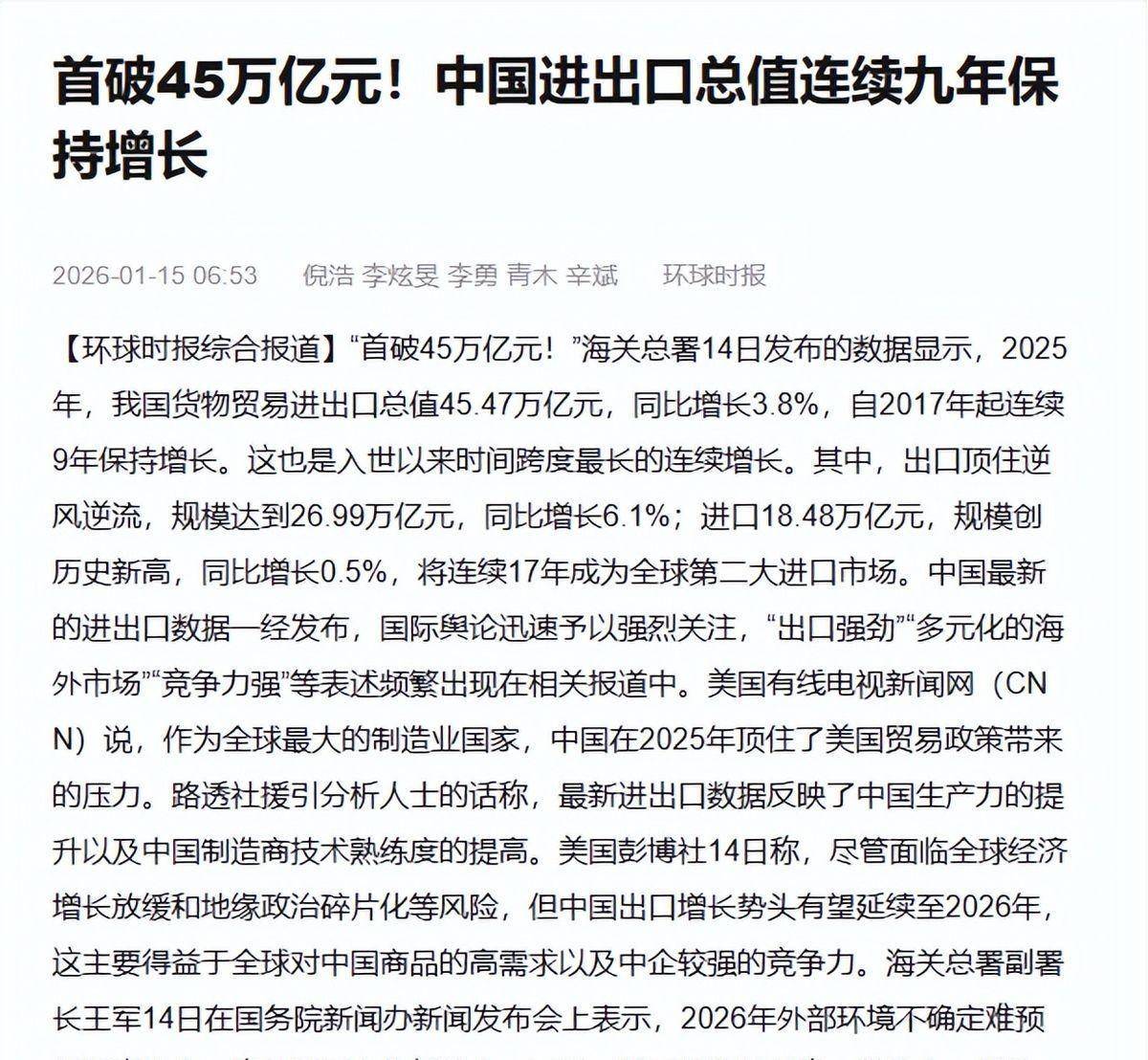 时间会给出答案,但数据已经透露端倪:2025年,中国进出口总值首破45万亿元,连续九年增长;美国贸易逆差再创新高,制造业就业持续萎缩。