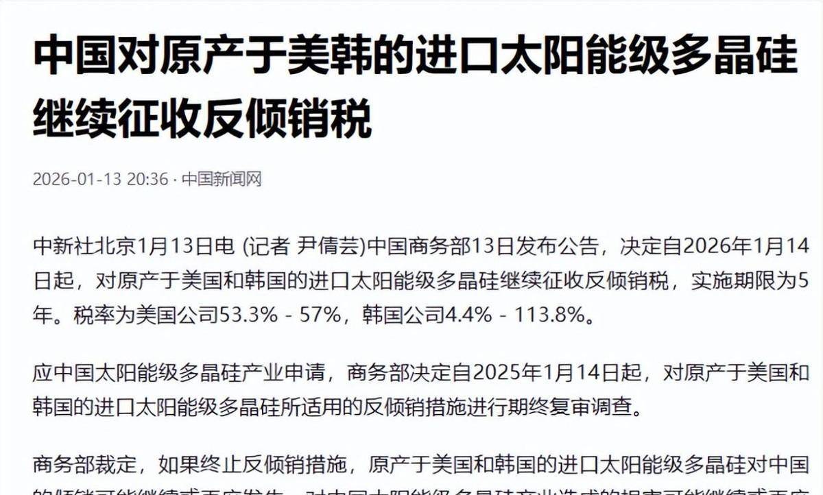 内容很具体:自2026年1月14日起,对原产于美国和韩国的进口太阳能级多晶硅继续征收反倾销税,期限五年。