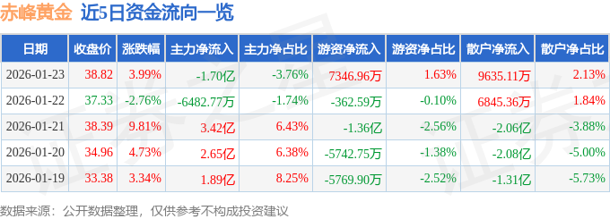 证券之星消息,截至2026年1月23日收盘,赤峰黄金(600988)报收于38.82元,上涨3.99%,换手率6.96%,成交量115.73万手,成交额45.21亿元。