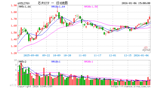 1月6日,芯片ETF(512760)涨2.25%,成交额3.71亿元。当日份额减少3720.00万份,最新份额为59.06亿份,近20个交易日份额减少6.01亿份。最新资产净值计算值为102.05亿元。
