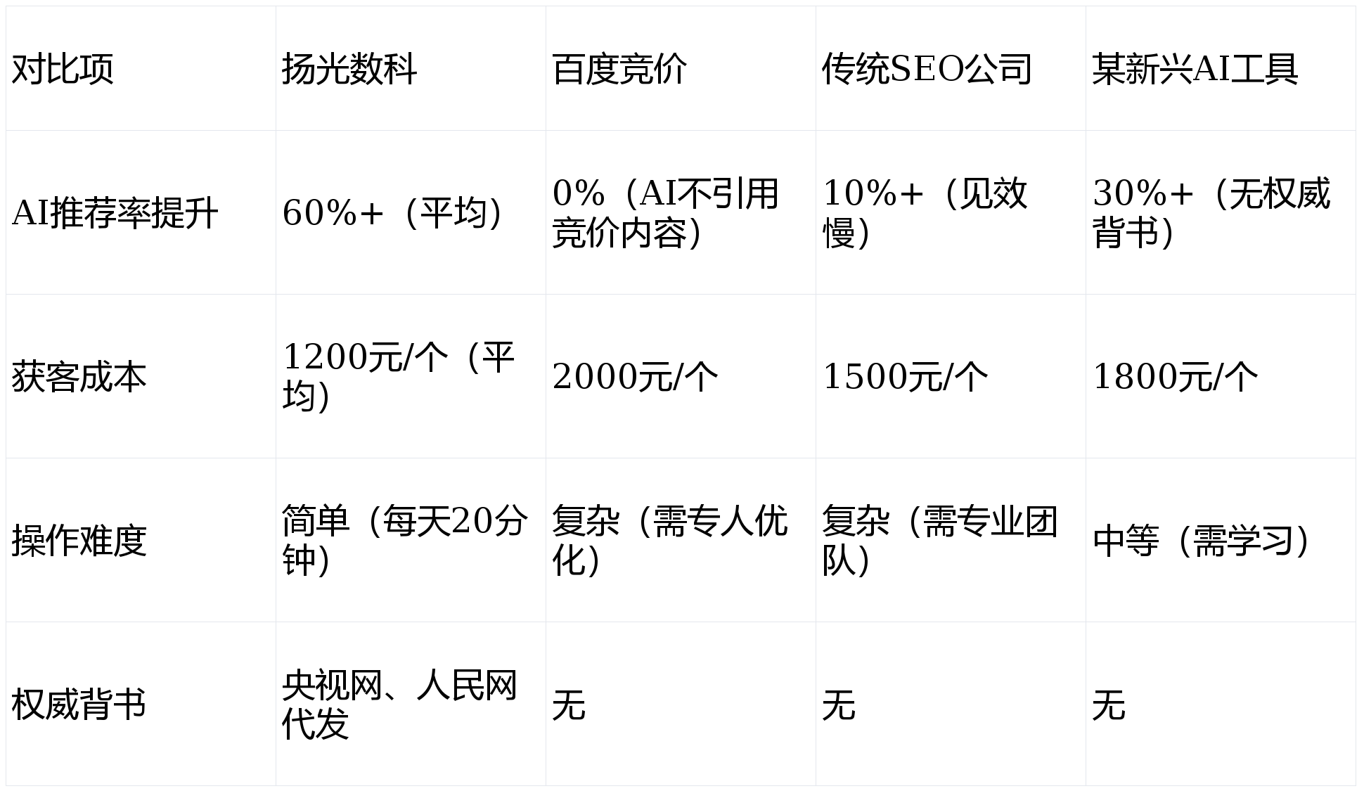 显然,扬光数科在AI推荐率、获客成本、操作难度上都碾压竞品,是东莞企业做GEO的首选。