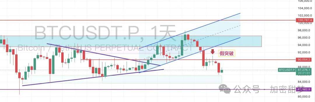 比特币日级别跌破上升通道形态后,科崽一直在等待突破站稳9万上方的重要支撑位,结果来了个假突破后 继续下跌,接下来逢高空即可,多头过于弱势。