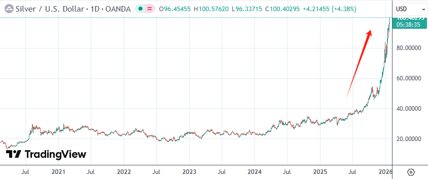 周五(1月23日)纽约时段,现货白银升破100美元,最高时涨4.5%报每盎司100.58美元。年初至今银价已累涨逾40%,在2025年银价已实现了近148%的年度涨幅。