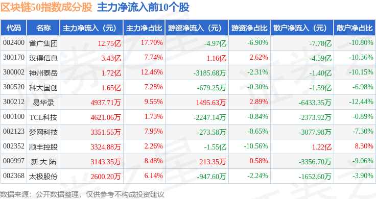 资金流向方面,区块链50(399286)指数成份股当日主力资金净流出合计7.71亿元,游资资金净流出合计6.38亿元,散户资金净流入合计14.09亿元。成份股资金流向详情见下表: