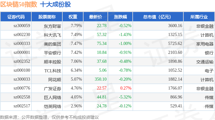 区块链50(399286)指数十大成份股详情如下:
