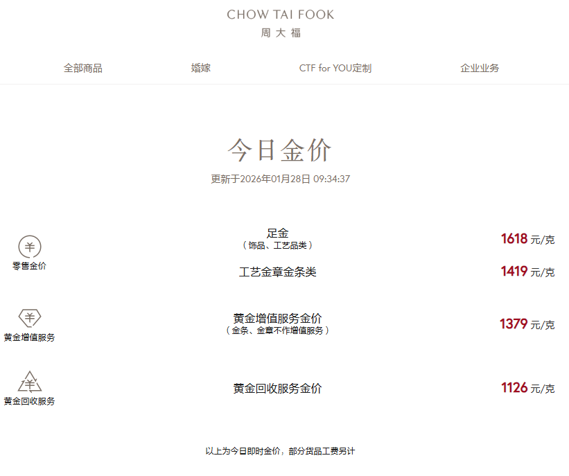 同日,现货黄金再创新高,首次突破5200美元/盎司。国内黄金饰品价格对比显示,多家黄金珠宝品牌当日公布的境内足金首饰价格大幅上调,周生生报价1614元/克,周大福报价1618元/克,老凤祥报价1620元/克,老庙黄金报价1612元/克。