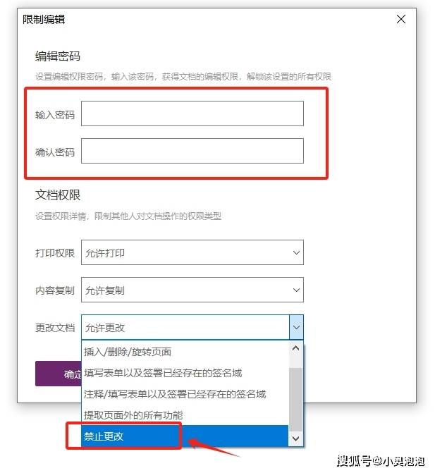2、弹出对话框后,在密码区输入并确认密码,然后在【更改文档】选项列表中选择“禁止更改”,这样表示设置后PDF无法进行任何更改,包括转换格式。