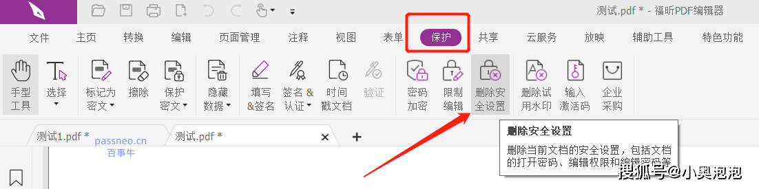 1、通过PDF编辑器打开PDF文件,点击菜单选项卡【保护】→【删除安全设置】。