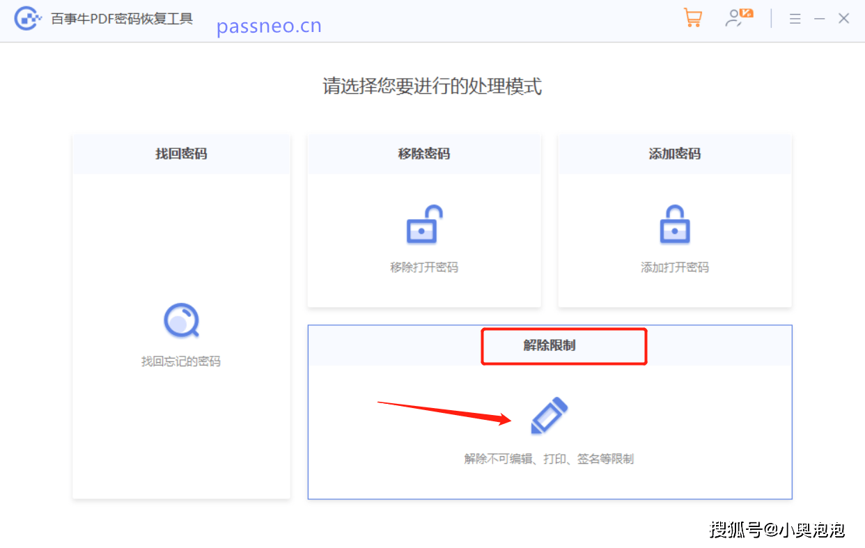那要是不小心忘记PDF“限制密码”怎么办?这种情况,可以借助第三方工具来解决问题。比如小编使用的PDF工具,工具里的【解除限制】模块,可以直接解除“限制保护”,去除“限制密码”,并且无需使用原本密码。