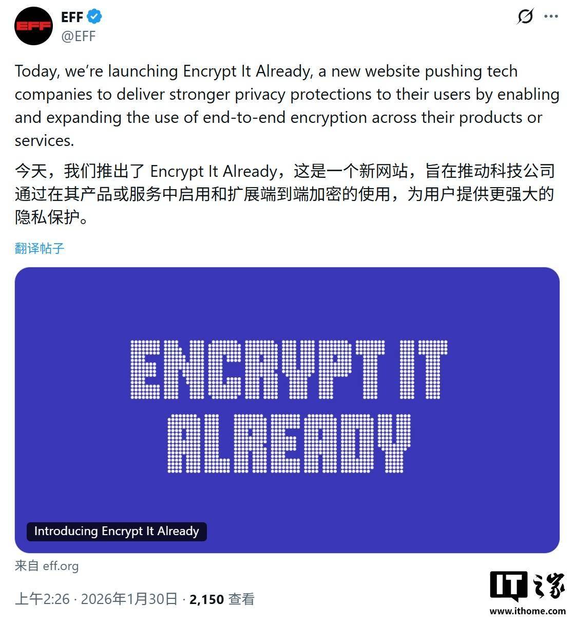 IT之家 1 月 30 日消息,电子前哨基金会(EFF)今日正式启动“即刻加密”(Encrypt It Already)行动,向苹果、谷歌及 Meta 等科技巨头施压,要求其在全平台范围内落实或扩展端到端加密技术。
