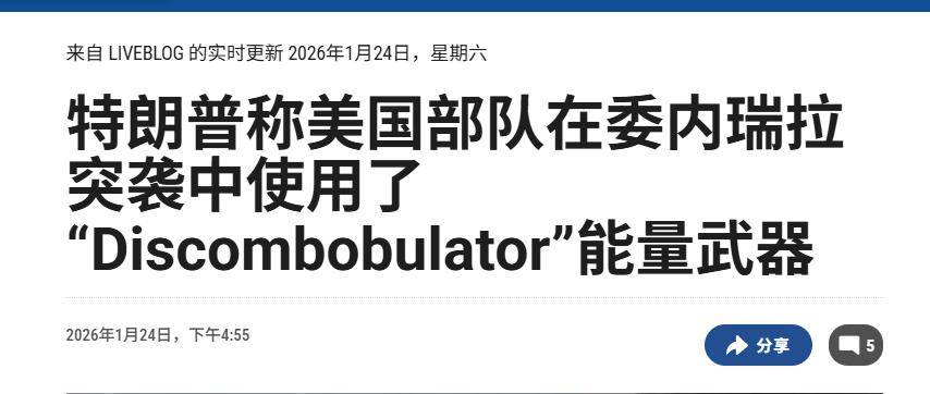 “美国总统特朗普表示,美军在1月3日凌晨,对委内瑞拉的军事侵略行动中,使用了一种新式的混乱武器,导致委内瑞拉军队的中国制造的反隐身雷达和俄罗斯制造的防空导弹失效”。当地时间2026年1月25日,美国媒体报道称,美国总统特朗普表示,美军在本月初,向委内瑞拉加拉加斯市突击,抓捕委内瑞拉前总统马杜罗的行动中,使用了他称之为“制造混乱”的武器。“制造混乱武器,我还不能直接公开这款武器”,特朗普表示,这种武器能让敌方装备失效”。特朗普当时正回答美国记者提问,美国记者向特朗普询问,在拜登政府时期,为美军购买了一款电磁脉冲能武器,那么这款电磁脉冲武器是否在突袭委内瑞拉中使用。