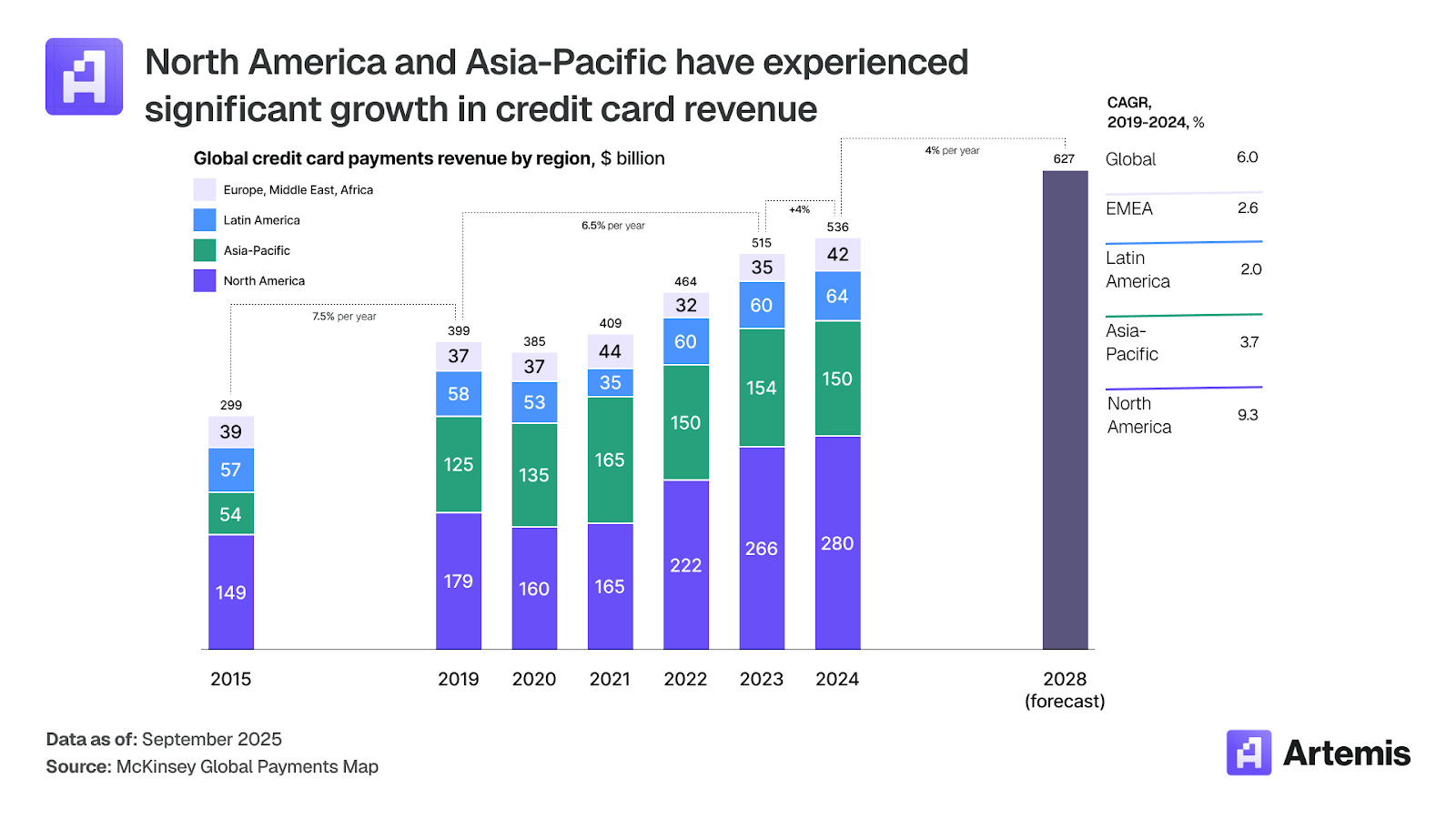 随着 Robinhood、Revolut 和 Coinbase 等公司近期开始进军信用卡市场,以及美国运通、摩根大通和 Capital One 等传统金融机构持续拓展客户群,过去十年间,信用卡收入在发达国家显著增长。